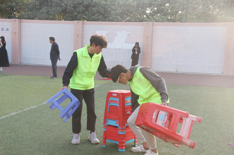 志愿者协助活动撤场 为打造温馨喜庆的汇演主场,协助演出顺利开展,志愿者们提前到场,听从现场指挥人员的安排,做好活动前的准备。汇演结束后,志愿者们负责维持纪律,组织学生有序退场,同时听从老师的安排,有序地进行撤场工作,包括搬凳子、折叠红布等。