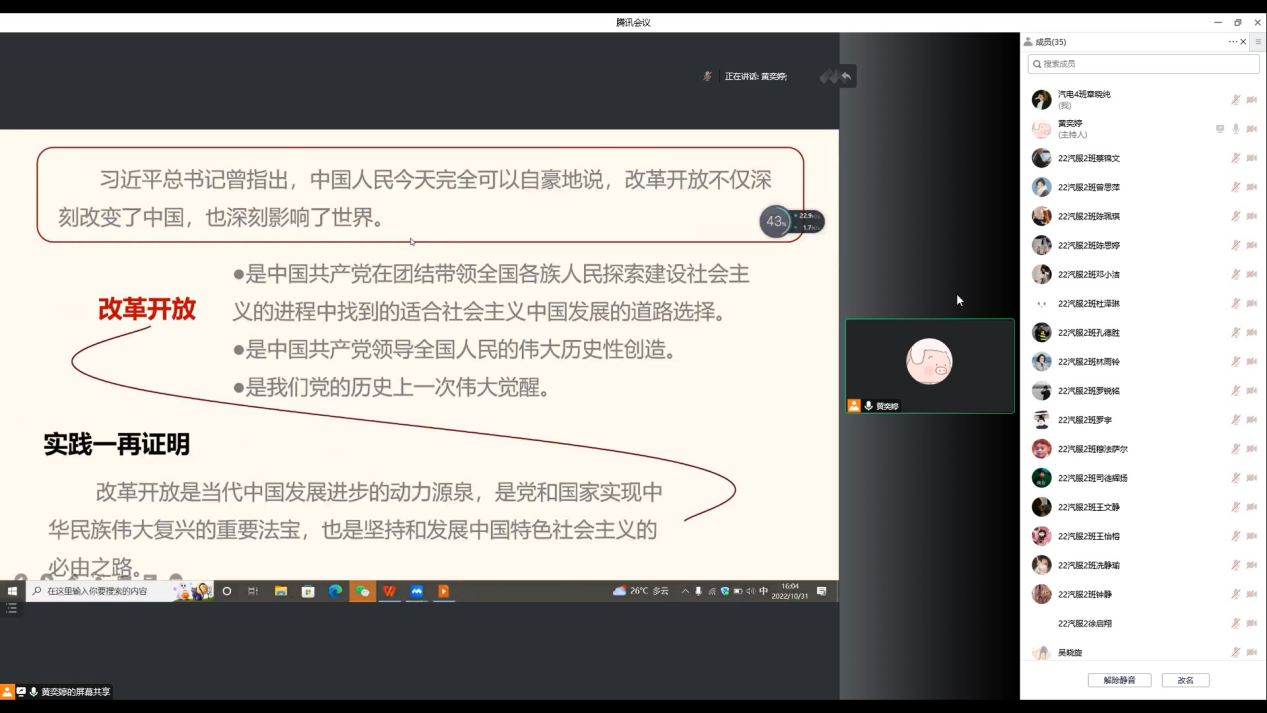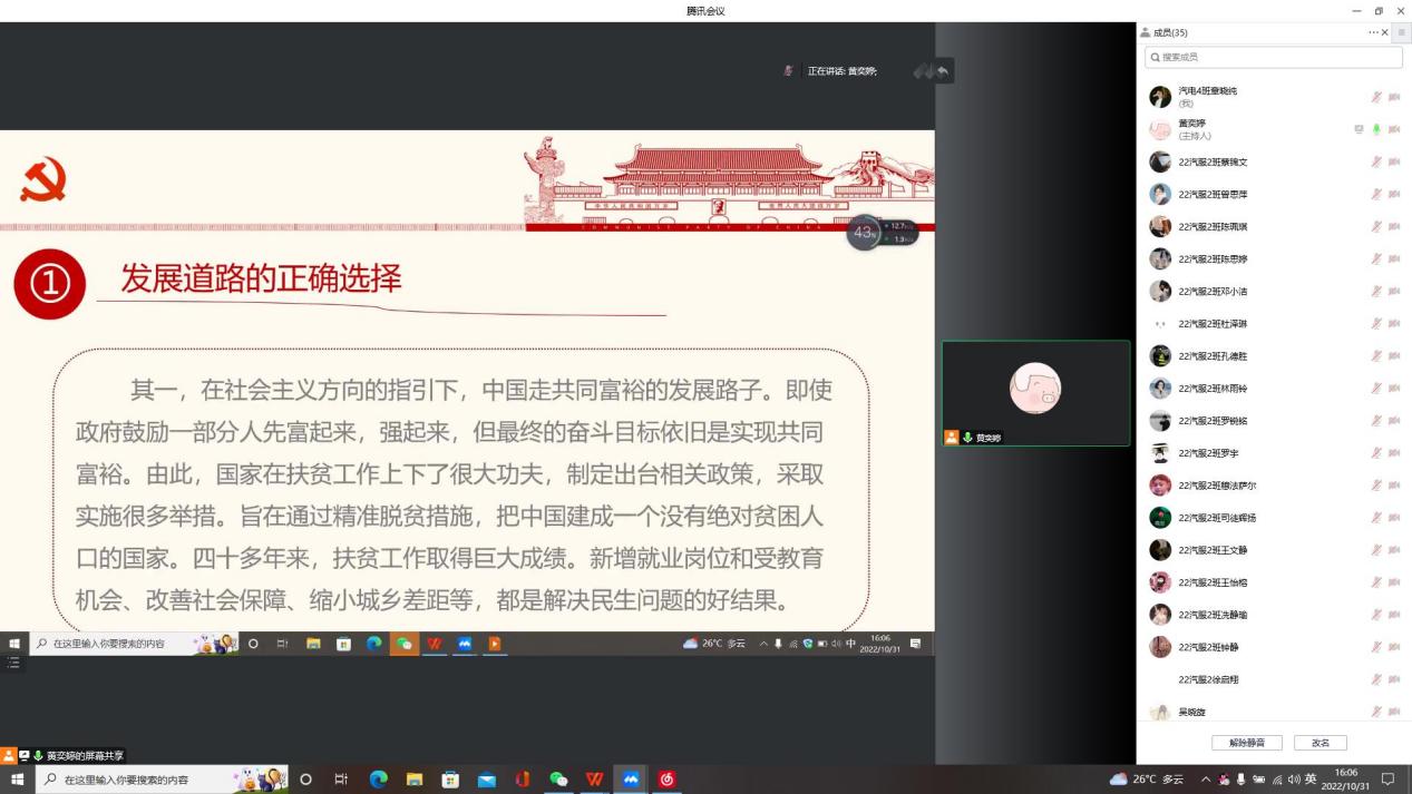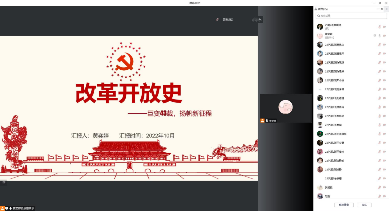 为认真贯彻习近平总书记重要讲话和中央政治局会议精神,不断提高党史学习教育的高度、深度、广度,引导广大学子坚定信念和使命,同时结合党史学习教育“五个一”活动,15vip太阳集团学生党史宣讲团成员黄奕婷于10月31日下午3点半在腾讯会议平台向汽车工程学院2022级汽车营销与服务专业2班的同学们宣讲改革开放史。