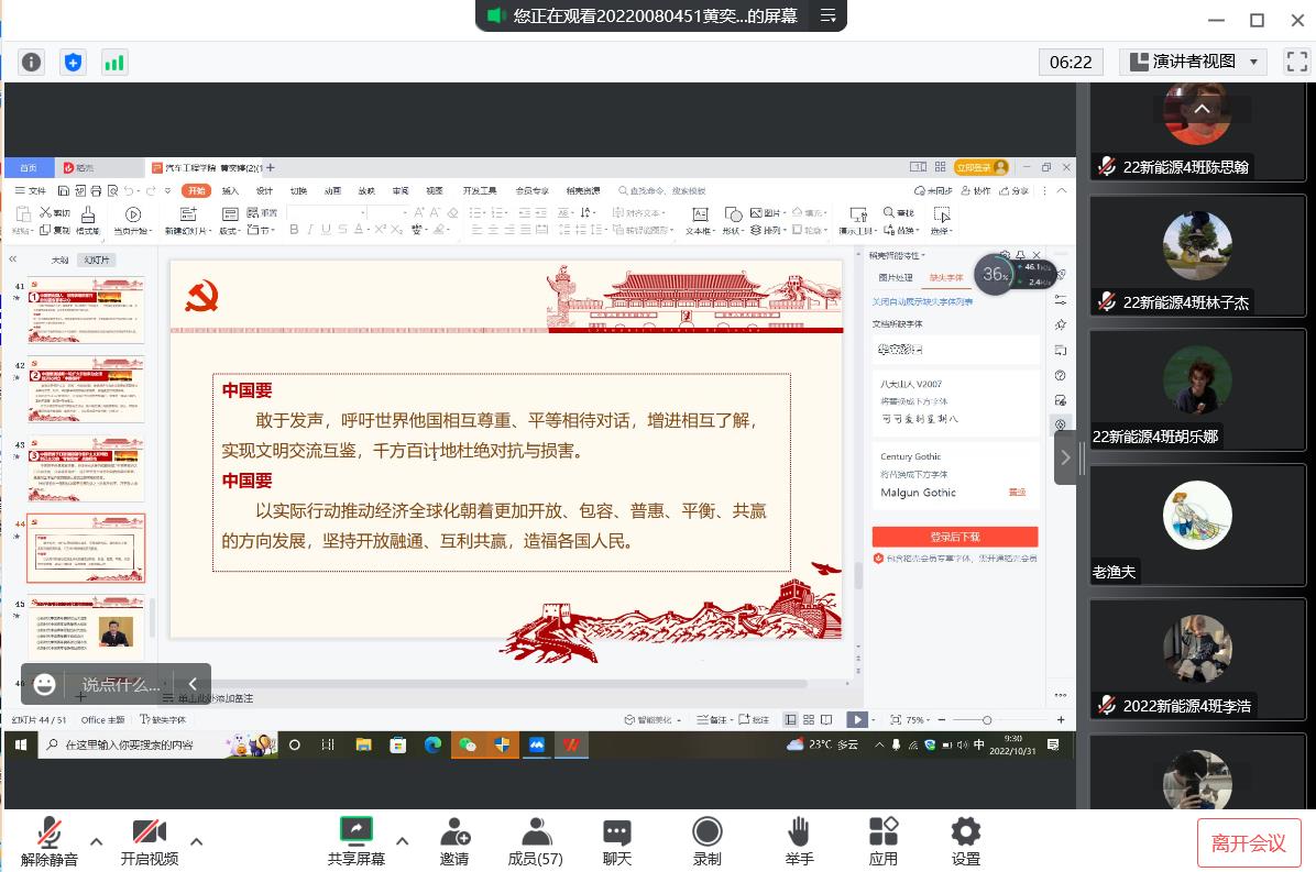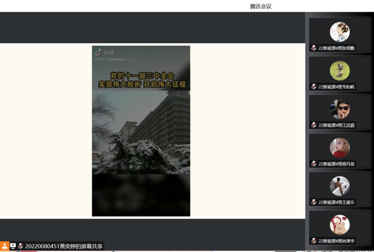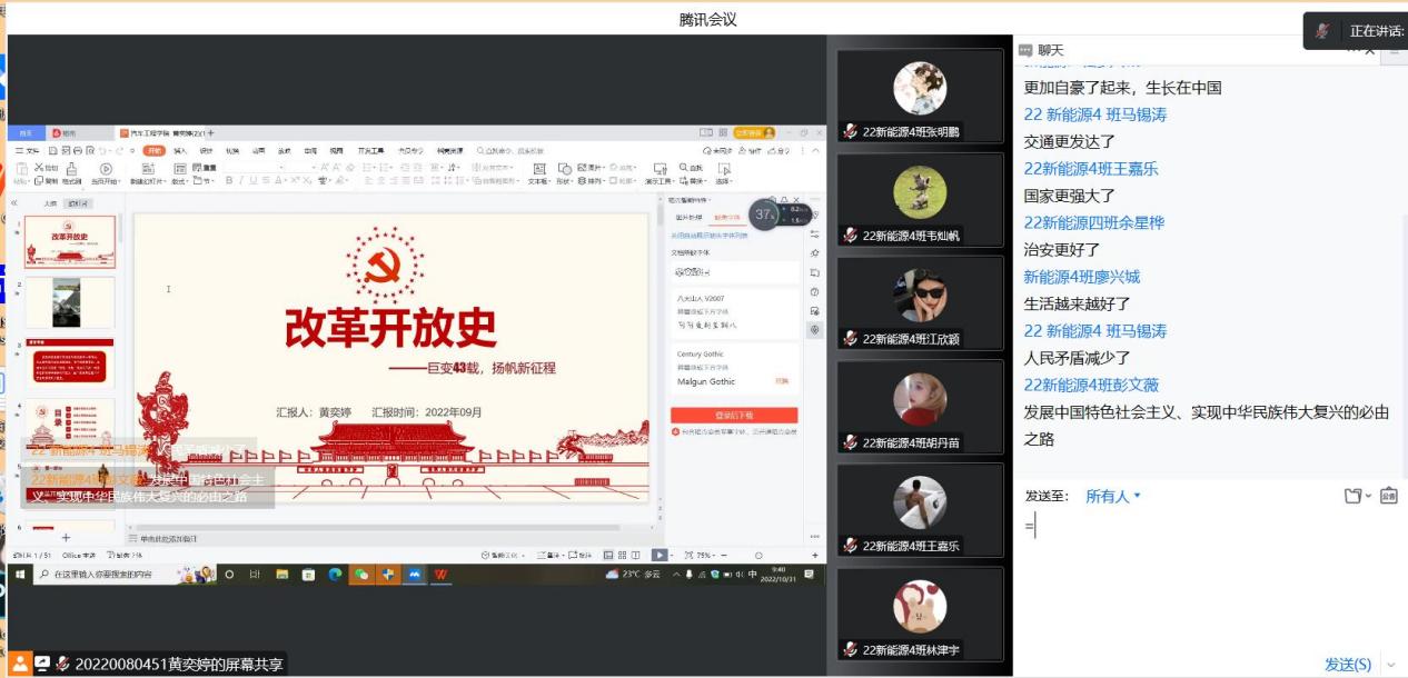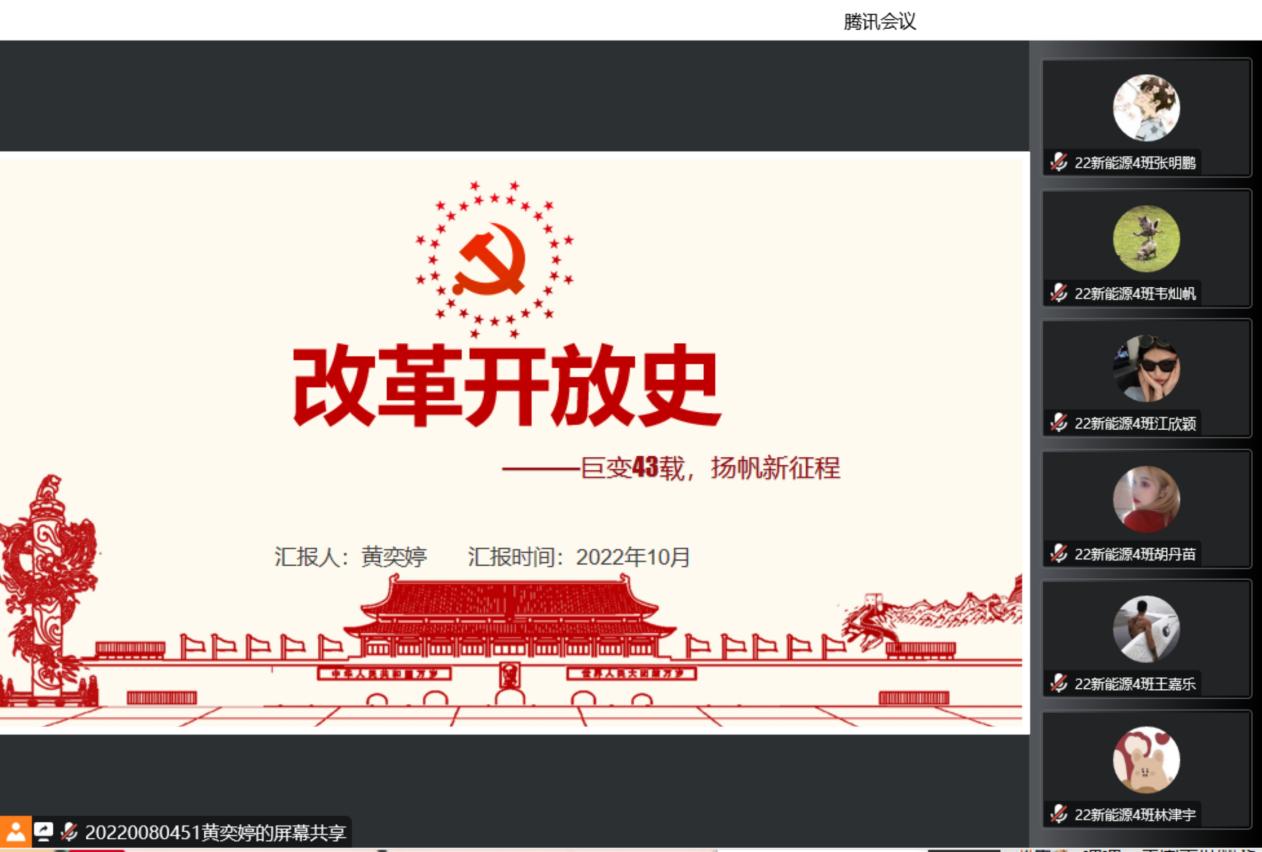 为深入学习贯彻党的二十大精神,推动党史学习教育深入青年,不忘初心,牢记使命,弘扬伟大建党精神,10月31日上午9点,15vip太阳集团“学生党史宣讲团”成员黄奕婷面向汽车工程学院2022级新能源汽车技术4班同学开展了线上党史宣讲——改革开放史。