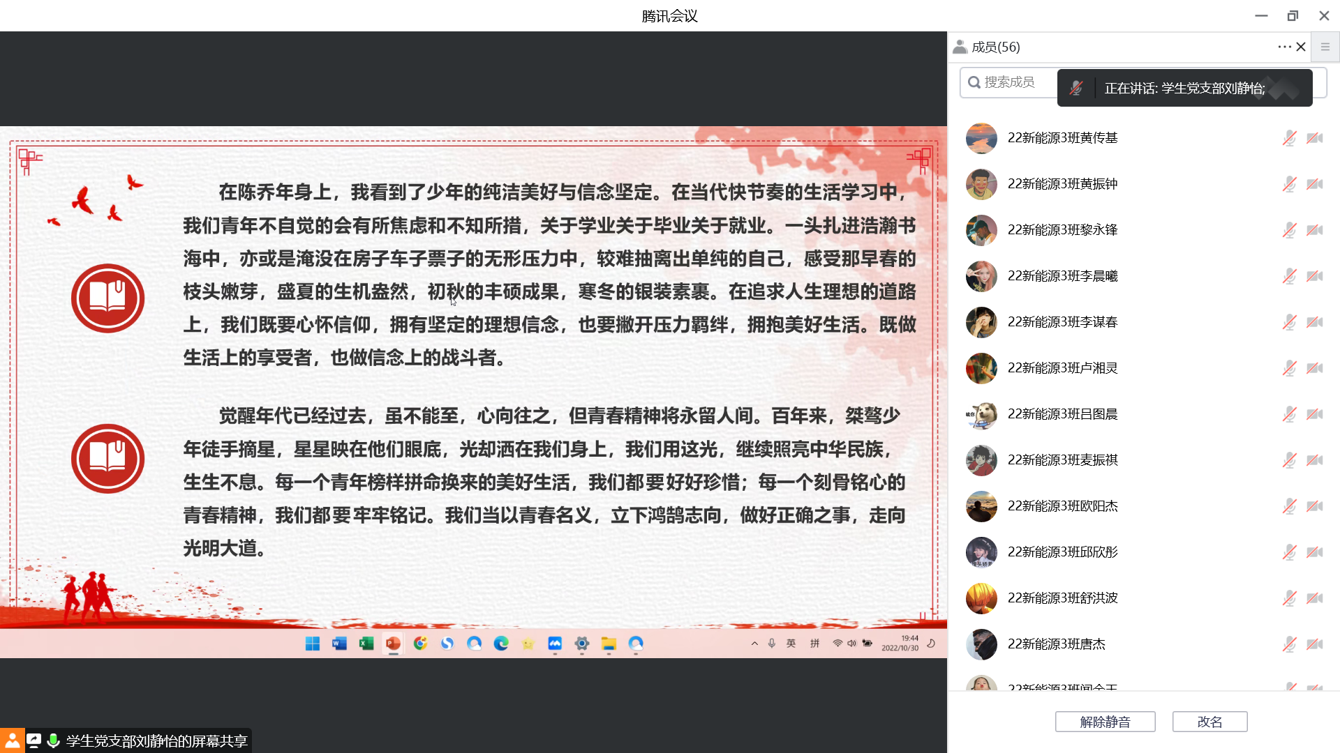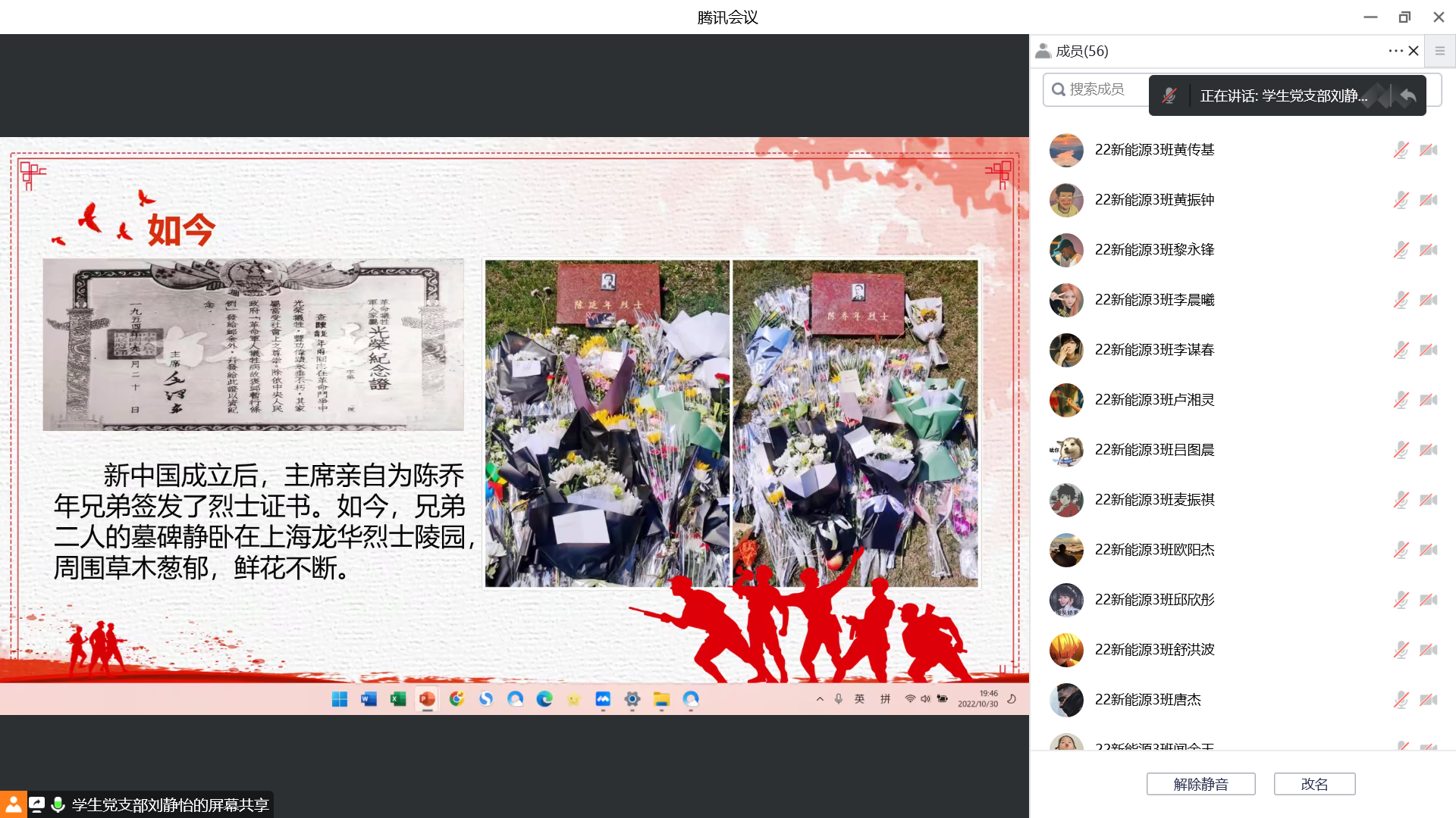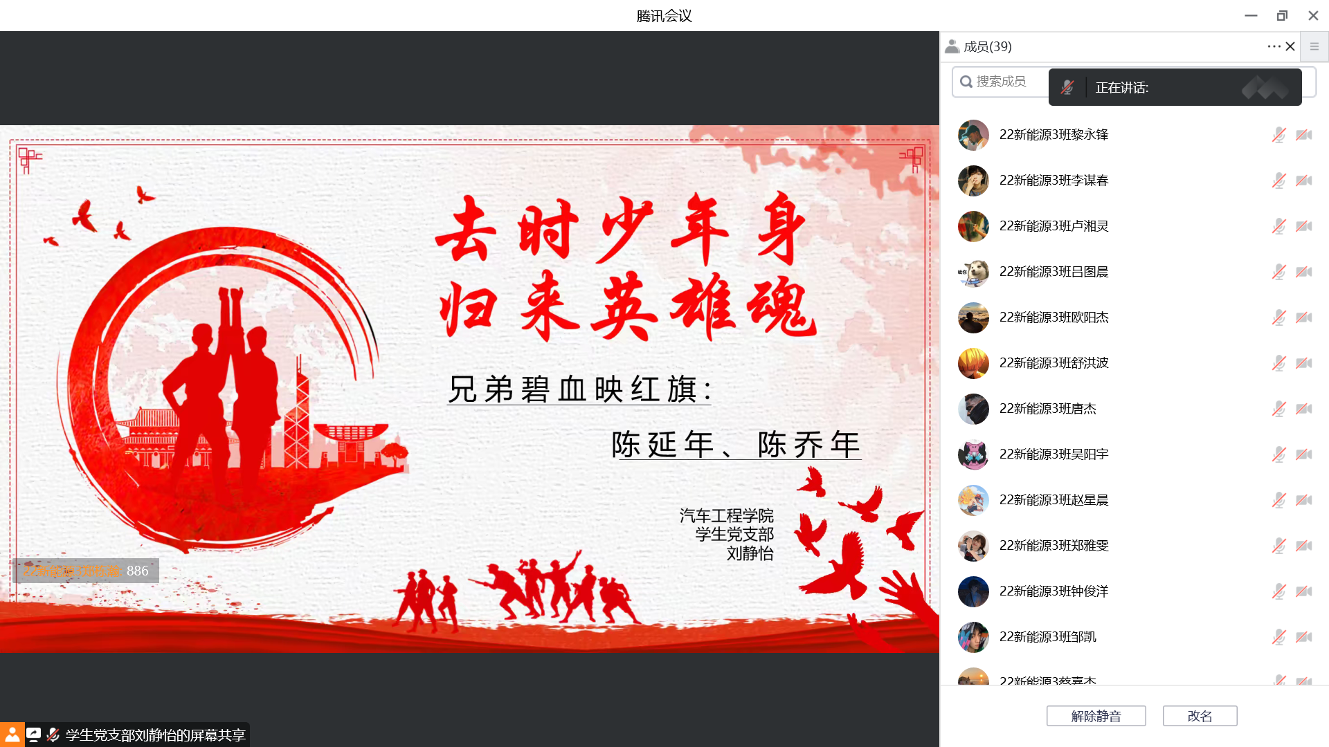 为庆祝党的二十大胜利召开,进一步推动党史教育深化人心,激发青年学生的爱党、爱国热情,引导广大青年学生学党史、知党恩、跟党走,10月30日上午10点,15vip太阳集团“学生党史宣讲团”成员刘静怡向汽车工程学院22新能源3班开展线上党史宣讲活动。