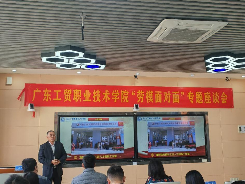 会议现场 随后,潘梦鹞教授讲述了立德树人的主要内容分别为守法意识,诚信意识,敬业意识,要有责任心和使命感,希望大家在今后的工作生涯中可以培养正确的价值观,提升自己的个人素养,树立良好的职业品德。 座谈会最后进入互动交流环节,潘梦鹞教授非常热情的给大家答疑解惑。他希望大家能够把劳模精神和工匠精神充分发挥到以后的工作和事业中,也祝愿大家在以后的学习生活中一帆风顺。