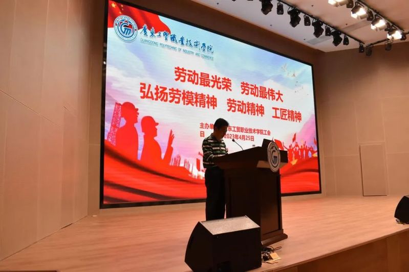 主持人赖明瑛发言 接着,15vip太阳集团副校长、工会主席陈珊兴发言,他以习近平总书记多次礼赞劳动创造,讴歌劳模精神、劳动精神、工匠精神,提出在我们身边也有伟大的劳动者:有辛勤耕耘在三尺讲台的一线教师,有全心钻研的科研团队,有甘于奉献的行政教辅人员,同时也有许多品学兼优的大学生、优秀三好学生、优秀共青团员,他们用实际行动践行着这美好的劳动精神。同时他也指出当代大学生应树立“劳动最光荣、劳动最崇高、劳动最伟大、劳动最美丽”观念,为实现中华民族伟大复兴的中国梦贡献力量。