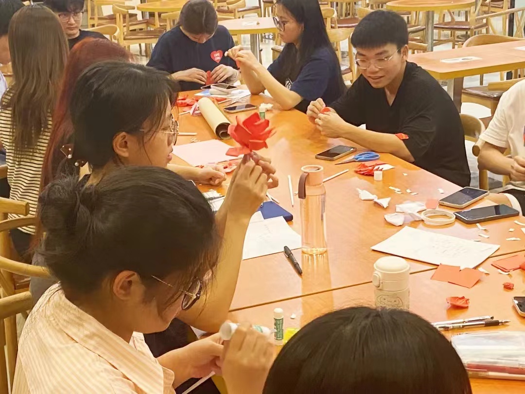 制作手工花现场 活动开始前,青协成员齐聚一堂,为宿管阿姨准备手工花和感谢信,希望能给她们带来小惊喜。活动期间,青协与军协成员手捧花朵穿梭在宿舍楼之间,将感谢信和手工花赠与宿管阿姨,让她们感受到学生的关心与尊重。最后,大家以一张大合照圆满的结束了本次活动。