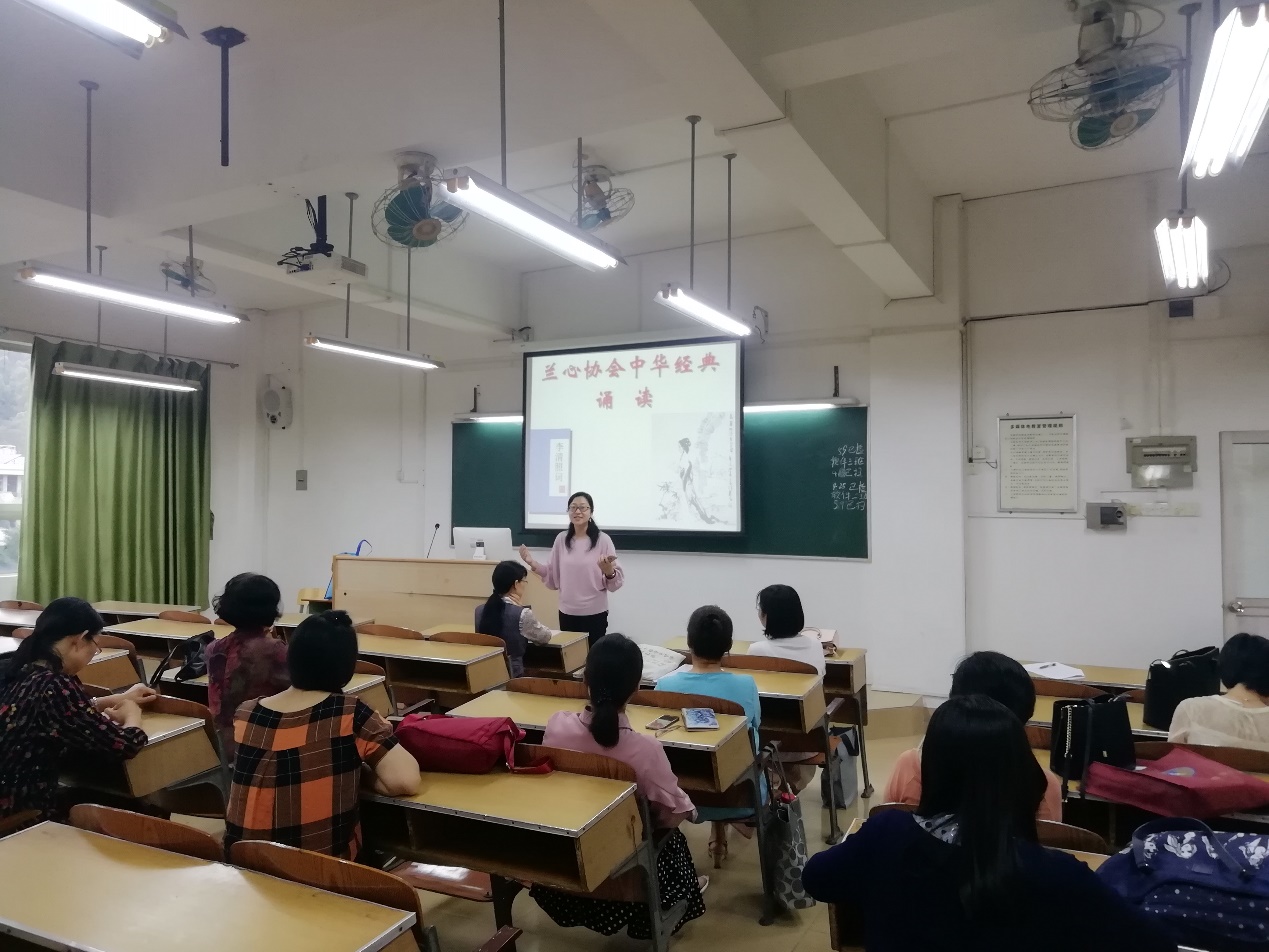 结合学校关于开展《“庆祖国七十华诞逐青春韶华梦想”系列主题活动之“诵国之经典展时代新华”中华朗诵会》的通知精神,2019年5月10日下午,兰心协会全体会员齐聚在天河校区西区综合楼501教室,聆听着悠扬的音乐,一起走进古诗词的浩瀚世界,大家一起感受诗的情怀,领悟词句的精妙之处。邓彩云老师给大家讲解了李清照两首《如梦令》的词,带领大家一起诵读李商隐的古诗《夜雨寄北》;李文婷、邱秀芳、黄妍、徐萌四位老师根据自己对文学作品的理解和感悟,以不同的风格演绎着篇篇美文,黄妍老师别具特色的粤语古词吟唱,更是把活动气氛推向了高潮。