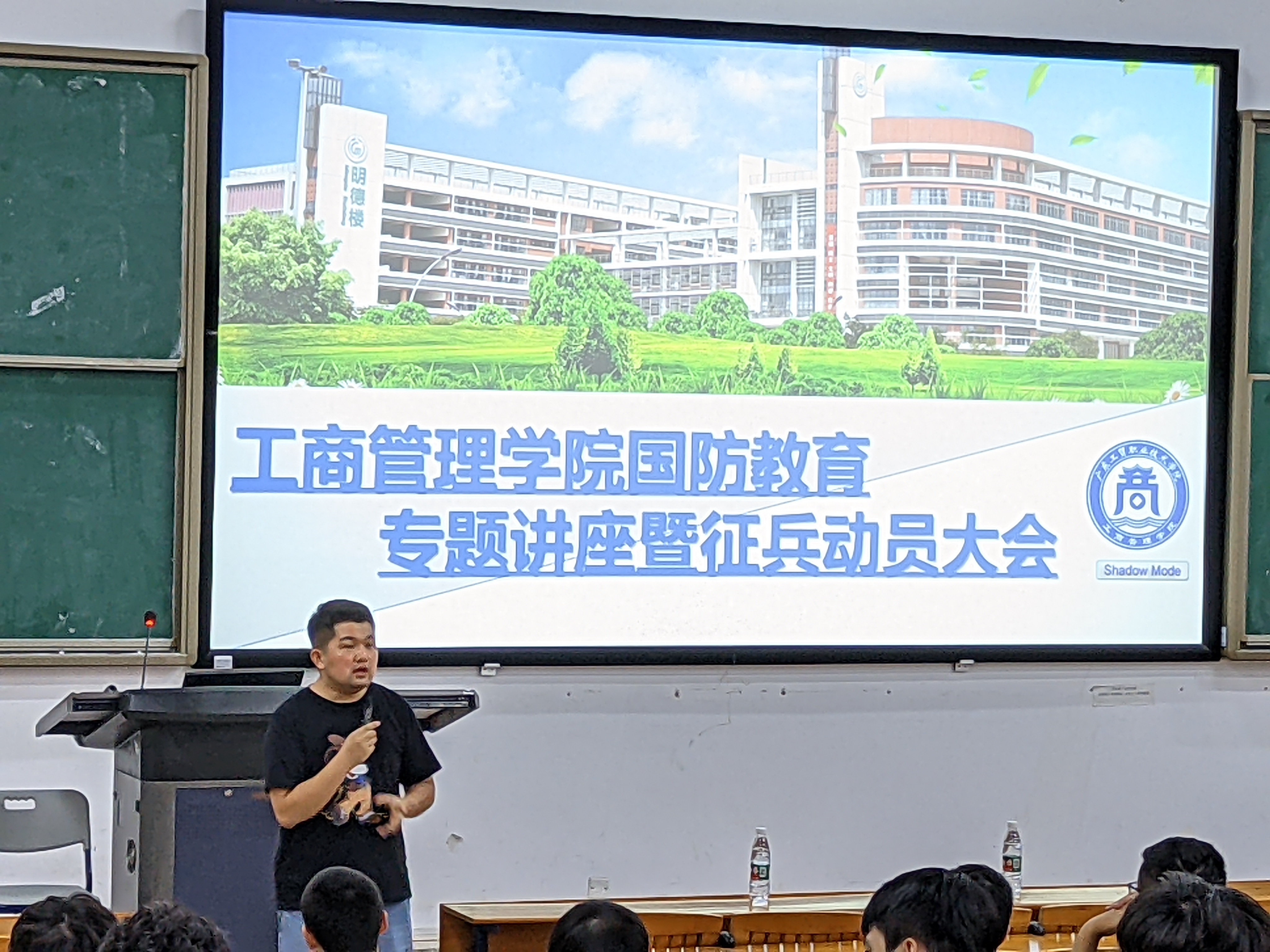 国防连着你我他,安宁维系千万家。6月27日晚,工商管理学院国防教育专题讲座暨征兵动员大会在明德楼2-103举行。学院邀请了武警军犬基地第二军犬队政治委员罗贤标开展本次专题讲座,学院党总支书记周清莲、辅导员王丹与学院近100名男生参加了本次讲座。