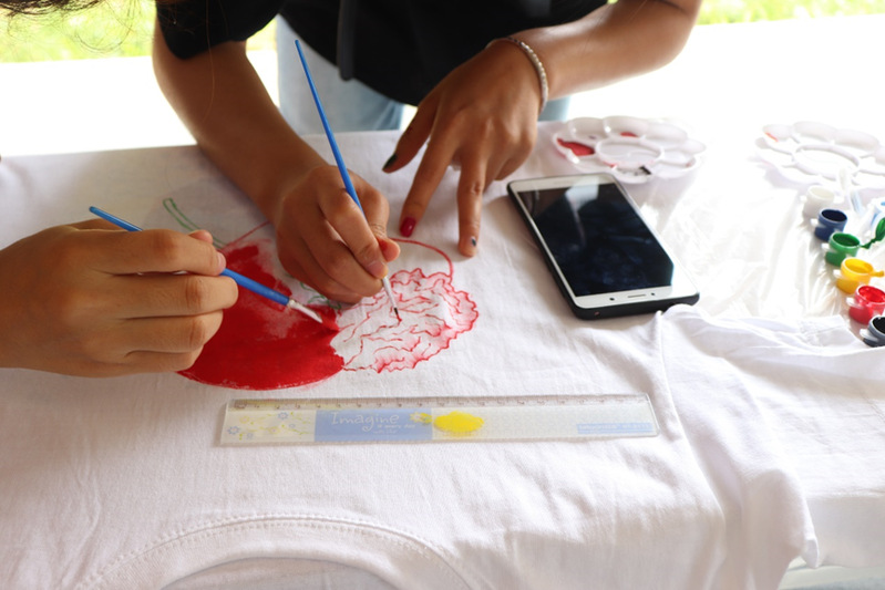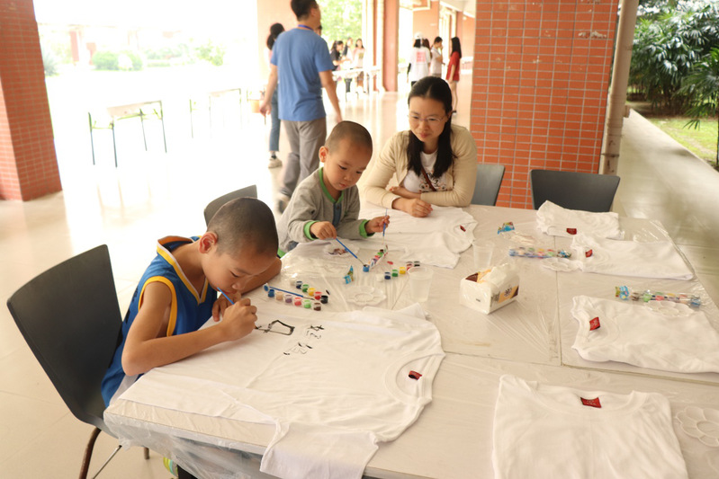 精彩的开场表演后,参赛选手也开始投入了绘画创作之中,他们认真构思、选颜配色,团队成员合理分工、积极配合;在这一个小时的比赛时间里,他们挥舞着手中的画笔,在白色的T恤上描绘着心中对母亲爱的诉说;随着时间的推移,一件件色彩斑斓且富有创意的T恤就跃然眼前。在比赛正激烈的进行的同时,“亲子区”这边的亲子手绘活动也进行的其乐融融。