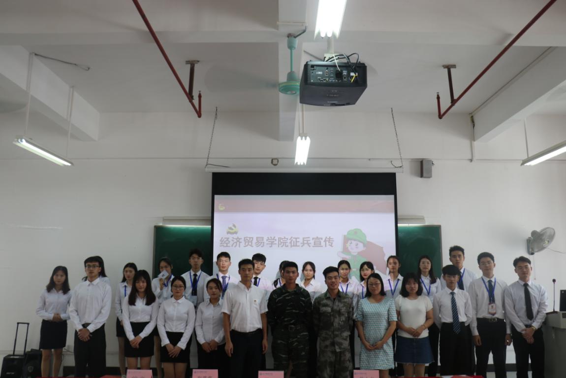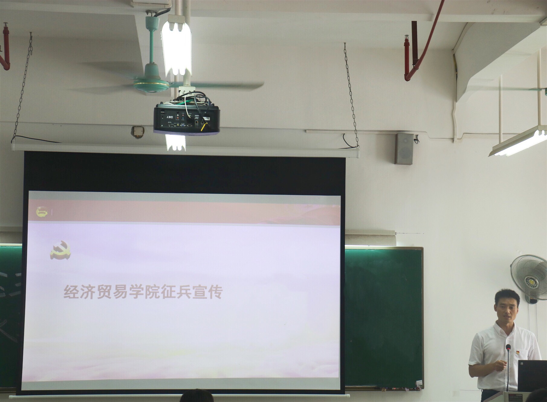 如果说人生是五彩缤纷的田野,那么青春就是其中最绚丽的一朵太阳花。在最值得尽情挥洒汗水,全力追逐梦想的青春时代,每一种奋斗的姿势都是青春花朵绽放的最美姿态。一千种青春,有一千种绽放姿态,在美丽的象牙塔时光里,除了在校园努力学习之外,还有没有别的选择,同样可以实现奋斗的青春梦呢?6月27日下午,经济贸易学院举行征兵宣传讲座,邀请了学校军事爱好者协会成员、来自测绘遥感信息工程学院的罗家俊、林智毅同学,来为大家讲述他们携笔从戎、报效祖国的别样青春故事。经贸学院学工办人员、各班级代表参加了本次讲座。