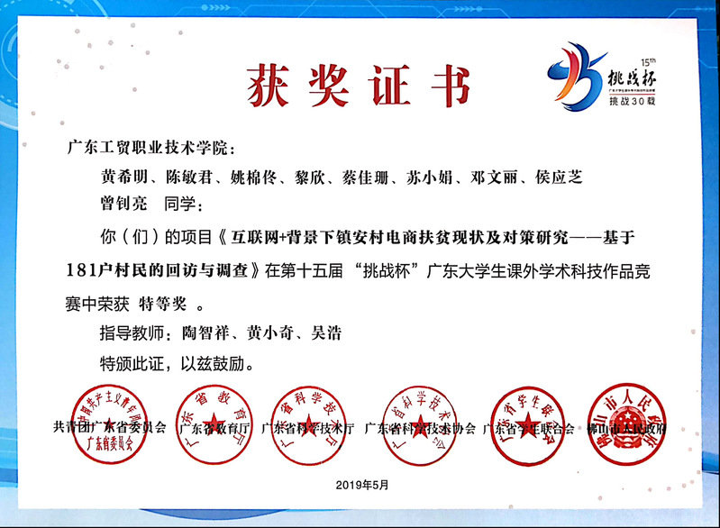 2019年《互联网+背景下镇安村电商扶贫现状及对策研究——基于181户村民的回访与调查》第十五届“挑战杯”广东大学生课外学术科技作品竞赛特等奖