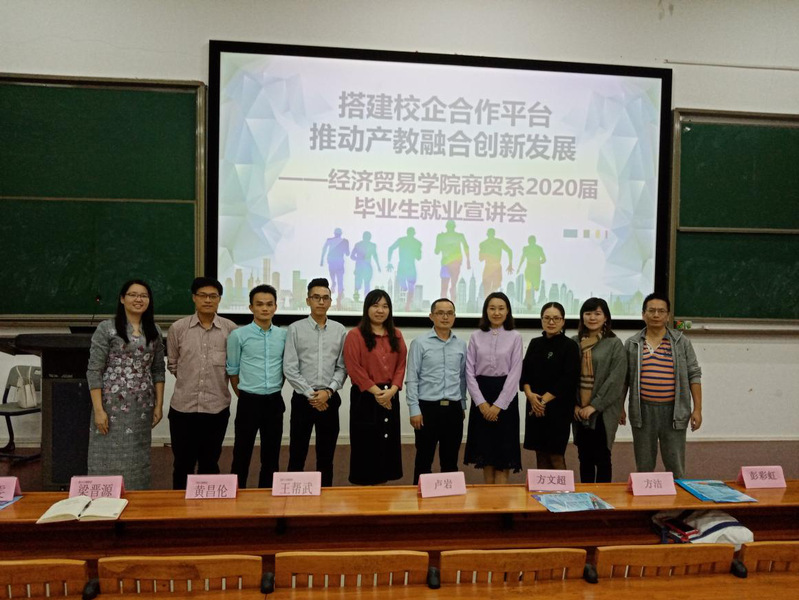 为切实做好应届毕业生就业工作,大力构建毕业生与行业、企业的交流平台,积极为用人单位输送应用型人才,11月12日晚,经济贸易学院商贸系邀请校企合作单位深圳合新科技股份有限公司在2-206举办了专场宣讲会。出席会议的学院领导和老师有经贸学院副院长方洁、电子商务专业带头人方文超、国贸专业专任教师彭彩虹、石如璧、卢岩,企业方代表有高级人力资源经理王帮武、广佛分公司人事经理黄洁雯、广州分公司销售代表黄昌伦以及佛山分公司销售代表梁晋源。会议由商贸系主任蒋晶主持,国际贸易专业和电子商务专业2020届毕业生出席会议。