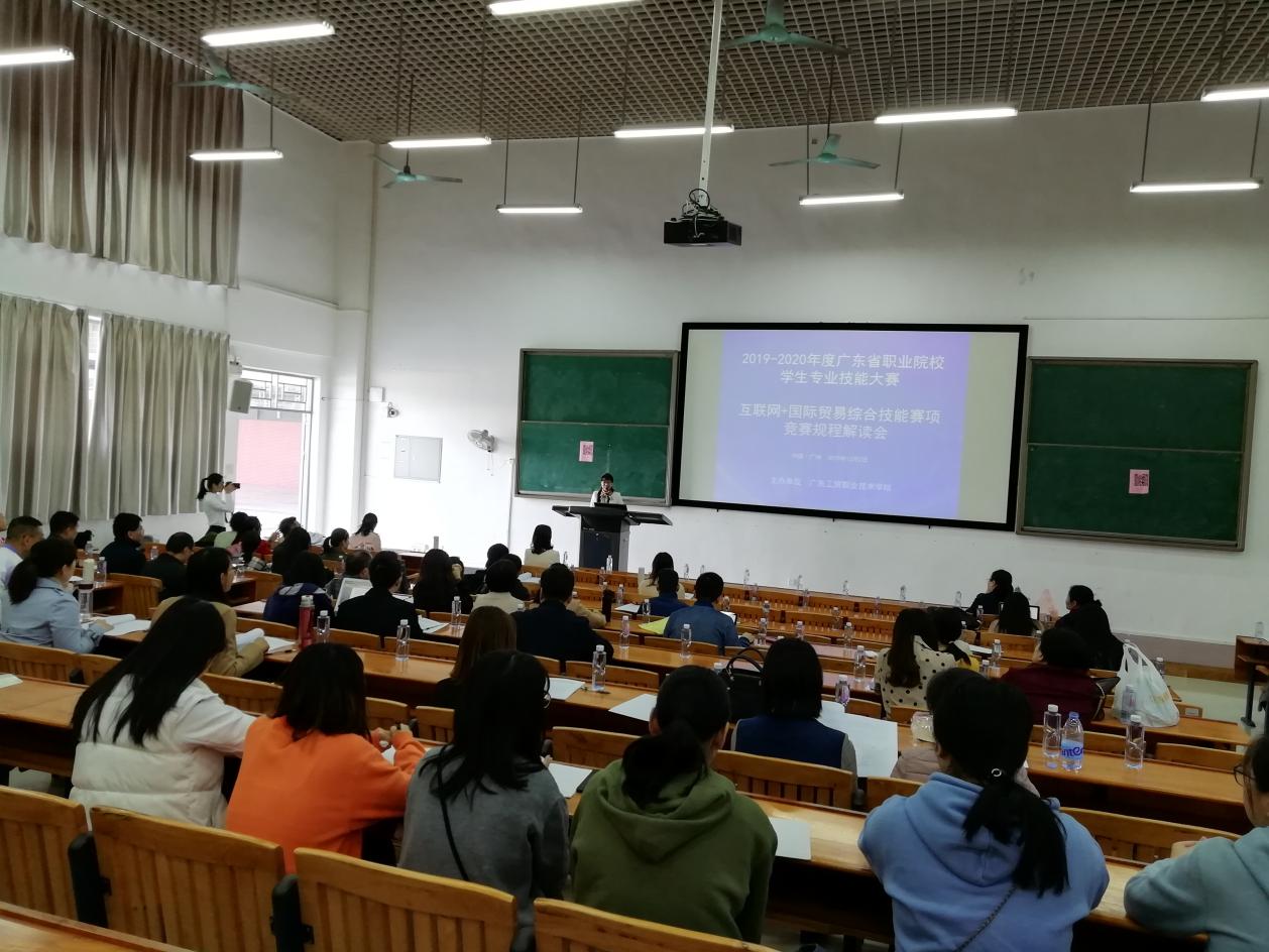 根据《广东省教育厅关于开展2019-2020年度全省职业院校学生职业技能大赛的通知》精神,经济贸易学院负责承担了“互联网+国际贸易综合技能”赛项的2019-2020年度广东省职业院校学生专业技能大赛承办任务。为保证赛事承办工作的顺利开展,确保大赛圆满完成,校领导何校长、赵校长高度重视,第一时间开展了总的部署和指导工作。经贸学院邱秀芳院长、王坤明书记、方洁副院长、商贸系主任蒋晶、办公室主任邓彩云等也认真及时地投入大量时间和精力,成立了执委会、制定了承办工作方案,并在11月27-28日组织召开了专家研讨会,审议了赛项规程,提前落实了参赛队员的食宿问题等;12月2日,召开了预报名参赛队伍指导老师参加的赛项规程解读会,由执委会成员、技术组副组长方洁副院长做了详细的规程解读,技术支持方南京世格软件公司的技术员蒋老师做了软件使用培训和答疑,国贸专业的彭彩虹老师耐心解答了参会代表提出的所有问题,来自全省30多所高职院校的指导老师也积极投入研讨,气氛热烈、效果理想,为大赛后续工作铺垫了基石。