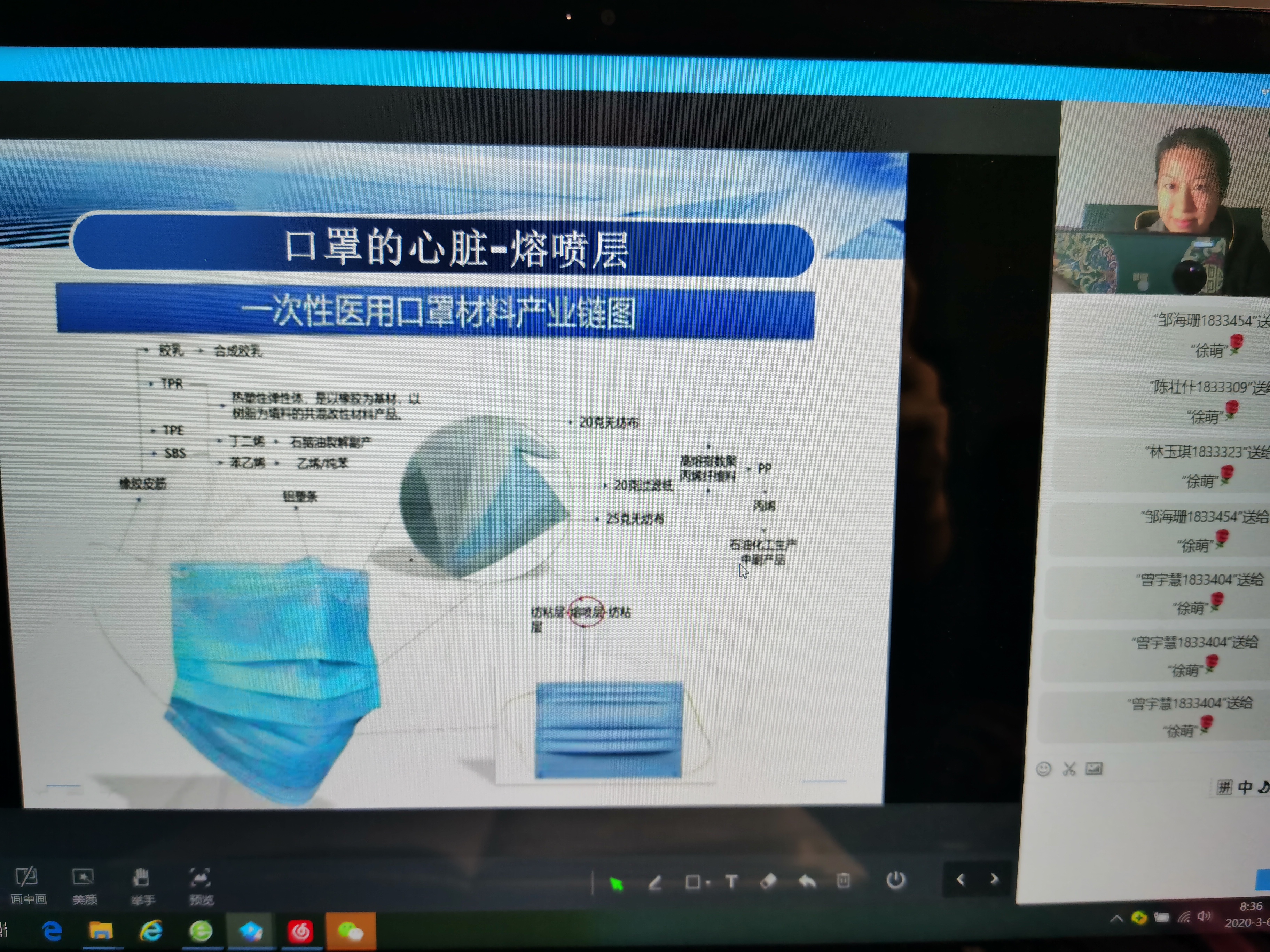 李波老师身在武汉,结合当前疫情情况及其亲身经历,在《网店运营》直播课程时提到电商行业在特殊时期发挥的作用李文婷老师在《外贸函电》和《外贸英语》的课堂上,充分结合新型冠状病毒的现状,讲解相关的英语单词,希望学生们能够从生活中学英语,用英语来描述生活。徐萌老师在《外贸跟单实务》课堂上结合口罩的生产和质量标准讲授产业链的相关知识。杨海娜老师在《分销渠道管理》课上提出这场疫情对企业的分销渠道发生的改变。张家靖老师则在《物流管理》课堂中提及物流和商流在战疫过程中起到的不可或缺的作用。陈靖云老师在教授《企业管理》课程时,结合肺炎疫情讨论疫情给各企业的经营活动带来的影响,将抗疫、口罩紧缺、贩卖假口罩等结合起来,对学生进行及时防诈骗教育。彭彩虹老师也将疫情现状和法律知识完美结合。