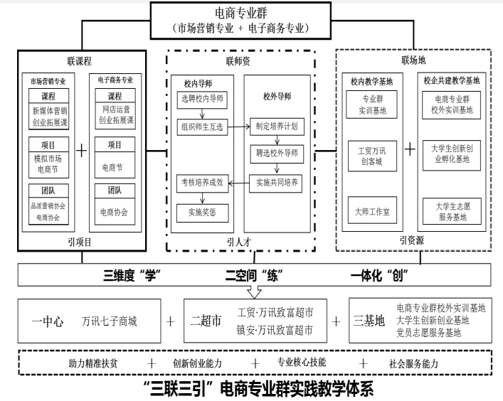 该成果以电商专业群实践育人和助力扶贫为目标,经过近7年的探索与实践,形成了“三联三引”电商专业群实践教学体系。
