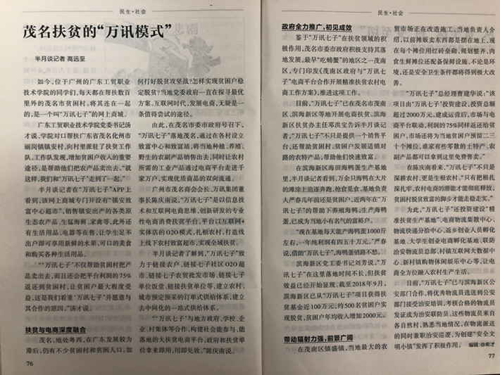 其中,“工贸·万讯”创新创业与精准扶贫相融合的实践育人模式全方位提升学生创新创业素质,得到了人民日报、半月谈、新华社等媒体的关注和报道。并在茂名市滨海新区、茂南区,广西马山县等地区40多个扶贫村得到推广和复制应用。湖北生态工程职业技术学院、广州公共事业技师学院等多个院校来访学习。