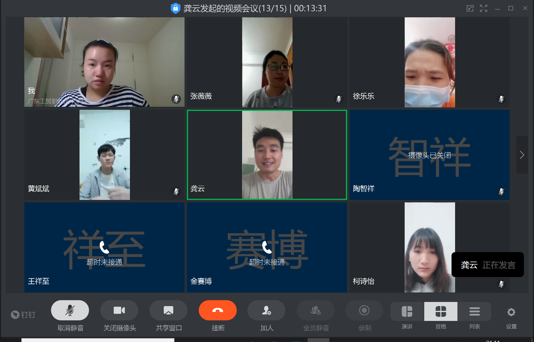 会议中,龚云传达了学校和学院全体领导、老师对同学们的关心。8位同学中,有正在找工作的,有在家准备各种考试的,还有仍然滞留在湖北的,龚云一一询问了各位同学的近况和遇到的困难,勉励同学们在此特殊时期,继续保持积极进取的心态,耐心等待疫情过后的开学通知。同学们也纷纷讲述了自己在疫情期间的生活学习等情况,表示一定会配合好国家和学校,继续做好防疫措施,定期报告情况,上好网络课程,以最好的状态迎接在工贸相聚之日。
