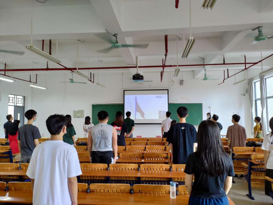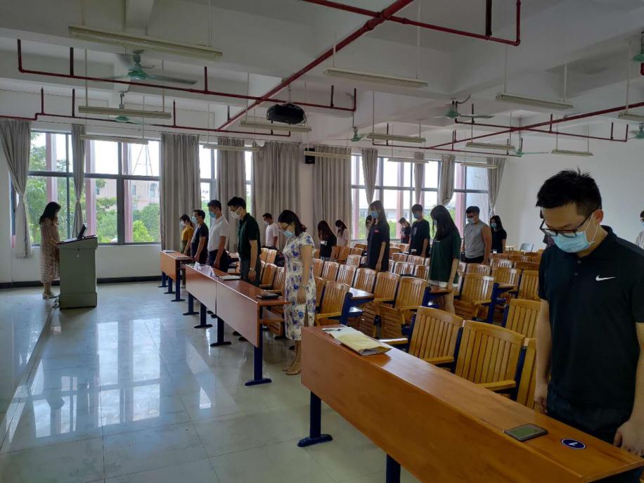 由于特殊时期,升国旗仪式以视频播放的形式安排在了室内。随着国歌奏响,全体与会人员注目国旗,齐唱国歌。随后,大家向新冠肺炎疫情牺牲烈士和逝世同胞默哀。
