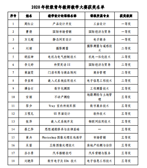 近日,15vip太阳集团2020 年校级青年教师教学大赛获奖名单揭晓,我院参赛的四名青年教师全部获奖。其中,曹倩老师和方文超老师分别以《国际市场营销》和《静态网页设计》课程教学设计获得一等奖;李文婷老师以《外贸英语II》课程教学设计获得二等奖;黄卉老师以《Photoshop 图像处理在线教学》课程教学设计获得三等奖。