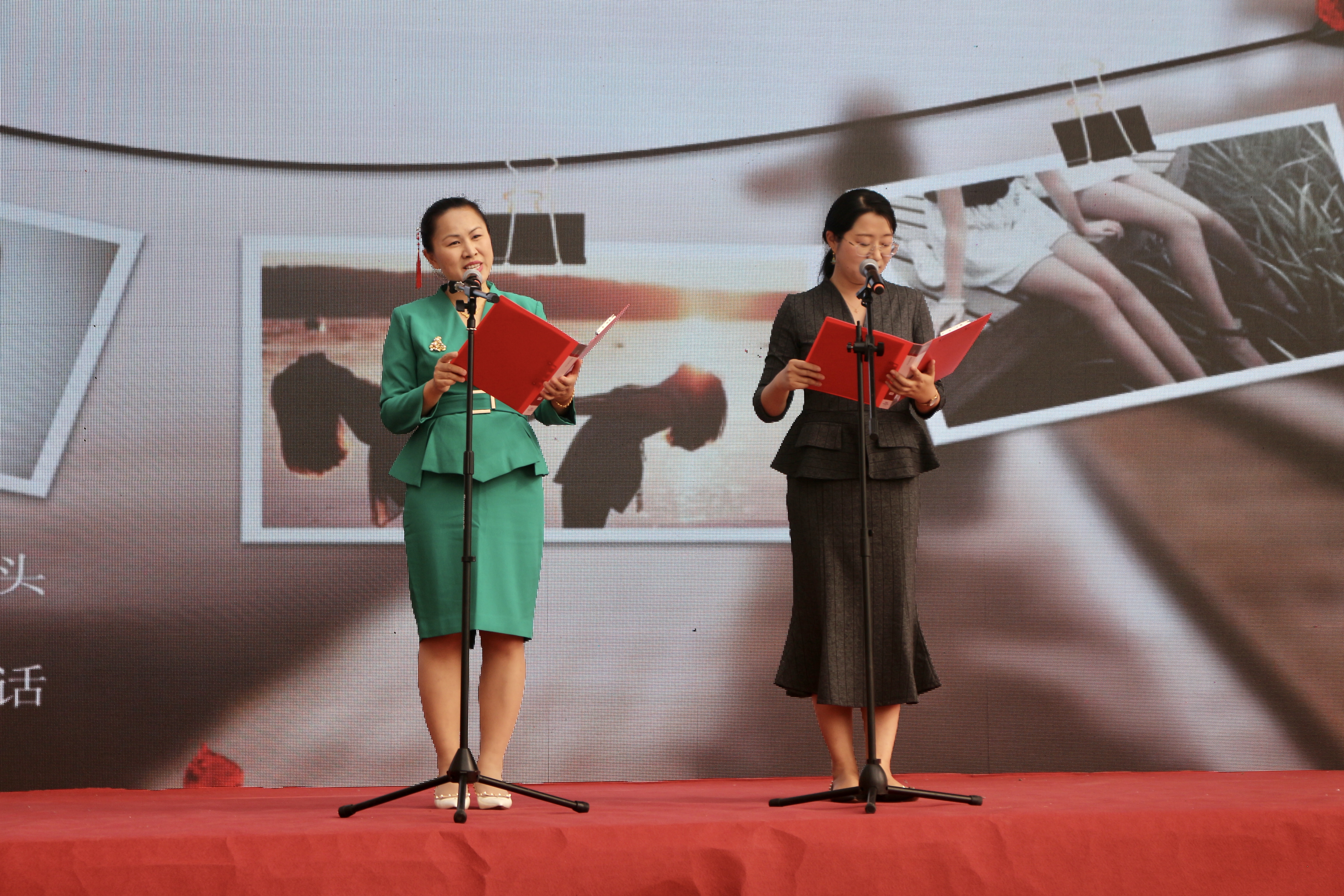 礼成,经贸学院教师廖晓虹、李文婷朗诵《写给青春》,并带领全体教师共同宣誓。