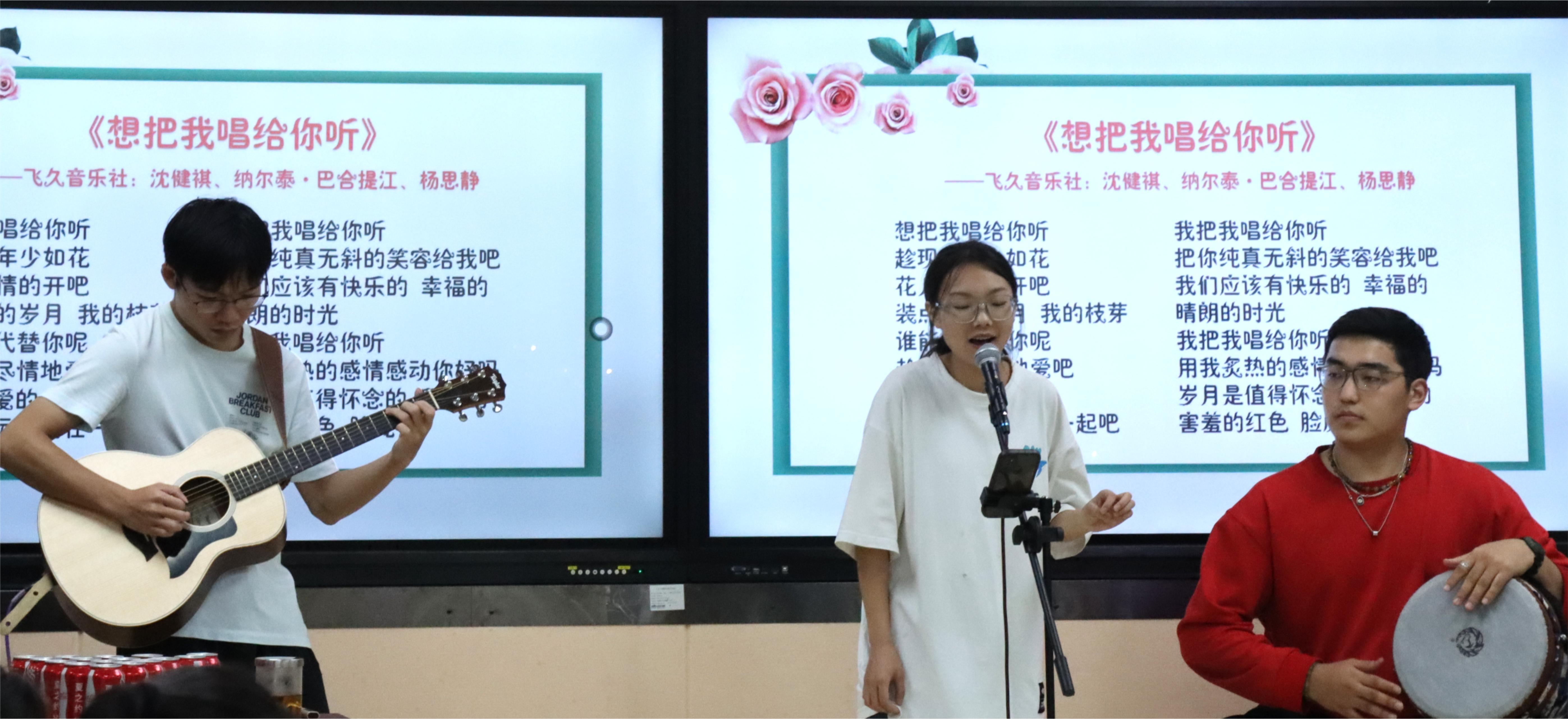 飞久音乐社的沈健祺、纳尔泰巴合提江和杨思静带来歌曲《奔跑》《想把我唱给你听》,让同学们体会到了只要持续奔跑,这个世界就会跟着你一起奔跑,表达热爱,热爱便不会被辜负。