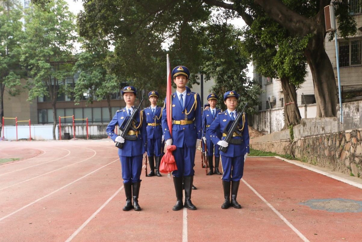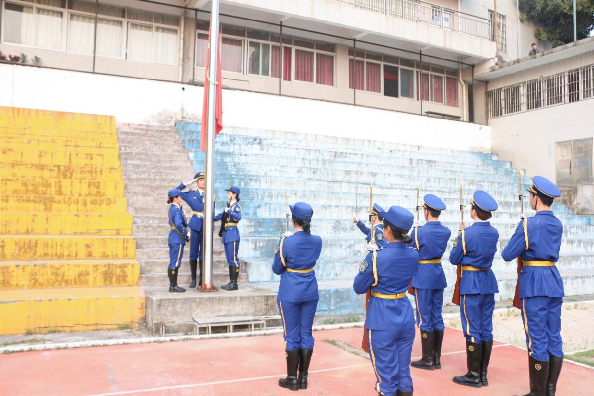 国旗班队员们早已整理好仪容,列好阵型,原地静候。一身戎装笔挺,抬头挺胸收腹,飒爽军姿与饱满精神遥映青年人的朝气。一声令下,在简明有力的口号声后,国旗方队跟随擎旗手踢着正步向前。步幅准确,步速均匀,走向笔直,军姿标准。伴随着激昂的国歌声,鲜艳的五星红旗冉冉升起,迎着朝阳和春风高高飘扬全体师生肃立注目、屏气凝神以热切的目光向国旗敬礼、唱国歌,传达炽热的爱国情怀和崇高的敬意,坚定而又执着,争做担当民族复兴大任的时代新人。