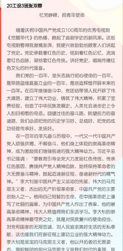 经过公平、公正的评审,此次活动共评选出一等奖1名:20数控3班的陈美欣《父亲与党的故事》;二等奖2名:20工设3班的蔡东晓《百年党史,敲出星星之火》,19机器人1班的吴宇绵《危急中国,小红船的共鸣》;三等奖3名:20自动化1班的杨端贤《记忆珍贵的党史》,19自动化3班的李耿东《忆岁月,颂英雄,洒红色》,20工设3班的张双蓉 《忆党峥嵘,担青年使命》,以及参与奖若干。