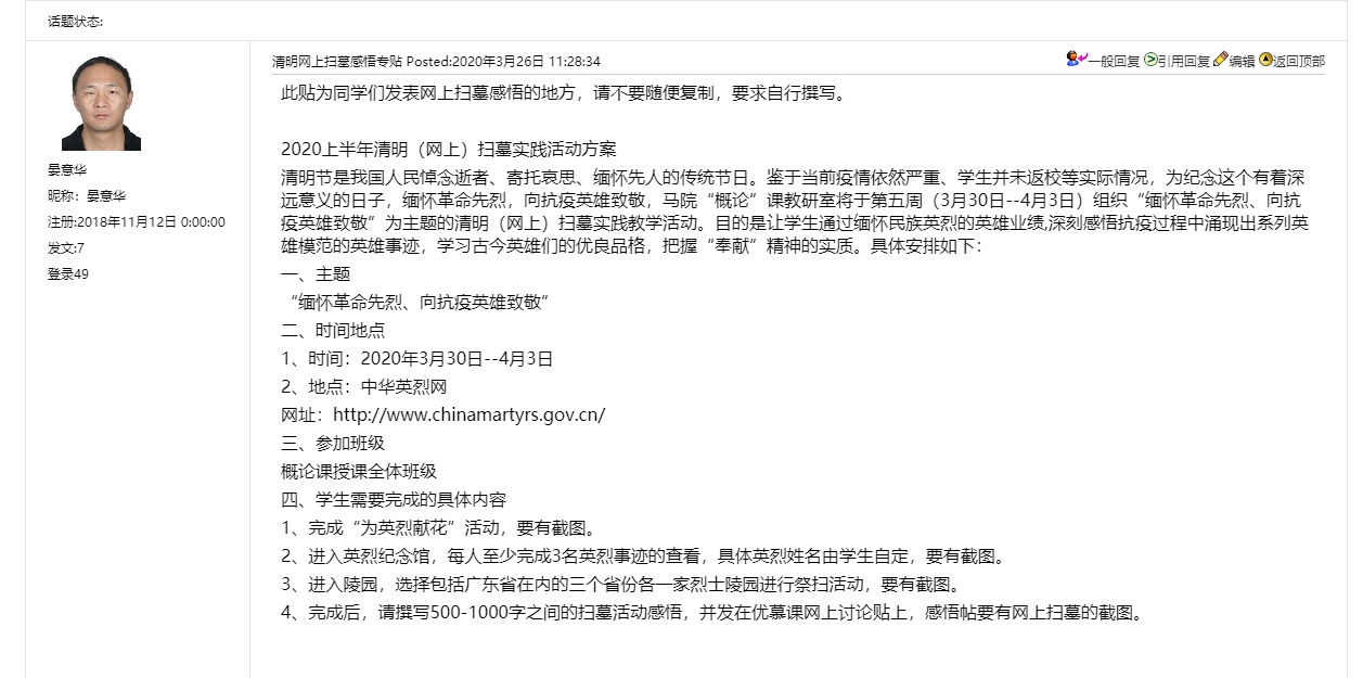 通知下发后,同学们迅速行动起来,纷纷按照通知要求开展了网上祭扫活动并第一时间在各任课教师优慕课平台进行互动交流。交流中,有的同学学习到了革命先烈的崇高理想信念和革命斗争的光辉事迹;有的同学被革命烈士抛头颅洒热血,不惜牺牲个人生命的事迹所感动;有的同学向革命英豪起誓,愿做孜孜不倦、不负韶华、勤奋学习、严于律己,不忘使命的当代大学生,努力为祖国建设贡献青春力量;还有的同学表示要向革命英雄学习,为实现“两个一百年”的奋斗目标砥砺前行,立志成为中国特色社会主义事业合格的建设者和可靠的接班人;也有的同学专门走进了“新冠病毒牺牲烈士纪念馆”,致敬在本次疫情中牺牲的“最美逆行人”。