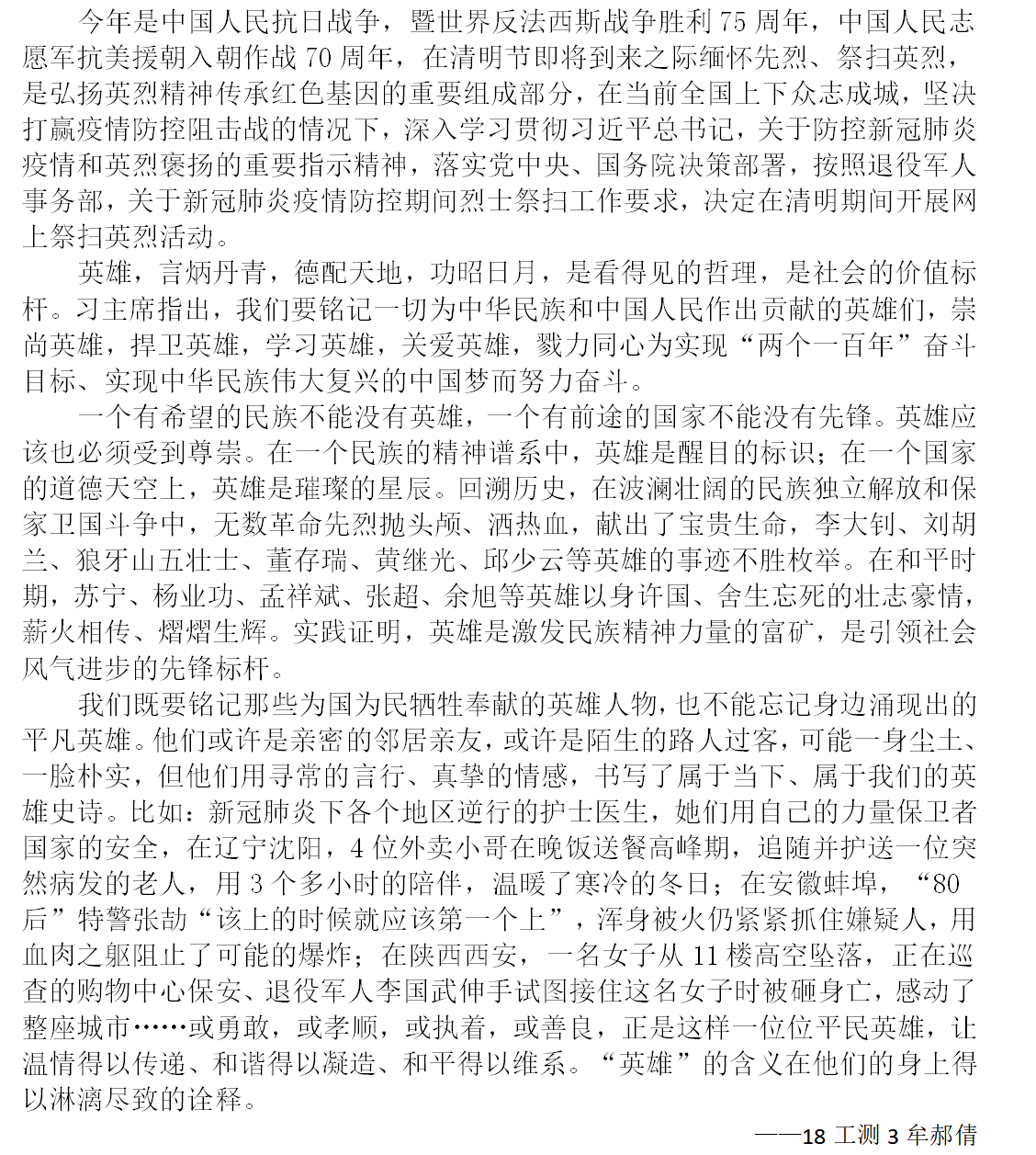 报答春光知有处,工贸学子效英才。本次网上祭扫活动,概论党小组全员组织,全过程引导,数千学生参加,大家纷纷感慨:悠悠清明日,致敬正当时,这是一场爱国主义教育的大课,既有仪式感也有时代感,是一次走心的活动,表示要在以后的生活学习中不断践行先烈精神,壮我中华,奉献智慧。这次特殊时期的清明网上祭扫活动取得了完满成功。