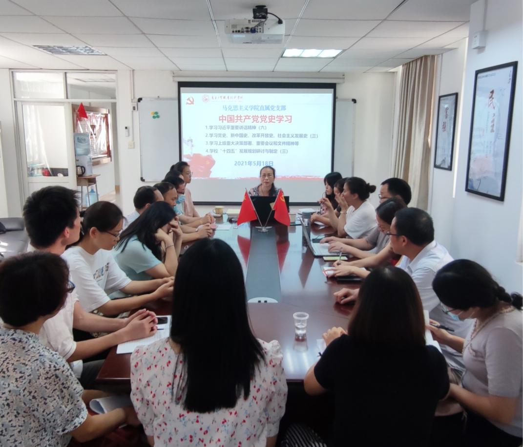 为进一步深入学习贯彻习近平总书记重要讲话精神,推进党史学习教育走深落实,提高党性修养,学出信仰担当,根据学校党委要求,结合学校教职工理论学习安排,马克思主义学院直属党支部于5月18日下午组织开展了政治理论学习及党员谈心谈话茶话会,书记李瑞清主持,全体教职工党员参加了会议。本次会议共分为两项议程: