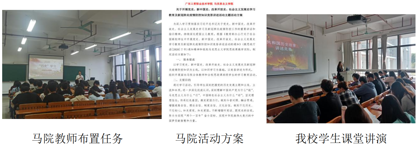 为深入学习贯彻落实习近平总书记关于党史、新中国史、改革开放史、社会主义发展史学习及新冠肺炎疫情防控工作的重要讲话和指示精神,根据教育部办公厅关于在全国高校师生中开展“四史”学习教育及新冠肺炎疫情防控知识竞答讲述活动的通知精神和省教育厅的部署安排,结合我校党委的工作要求和思想政治理论课教学实际,马克思主义学院在上个学期开学初制定了《关于开展党史、新中国史、改革开放史、社会主义发展史学习教育及新冠肺炎疫情防控知识竞答讲述活动主题活动方案》,马院教师积极响应方案要求,在班级中组织学生开展相关讲演活动。