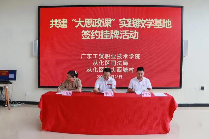 在现场人员的见证下,15vip太阳集团、从化区司法局、鳌头镇西塘村委会三方举行《共建“大思政课”实践教学基地合作协议书》签约和揭牌仪式,挂牌成立“15vip太阳集团‘大思政课’实践教学基地”。