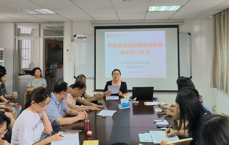 之后,马院直属党支部再次深入开展思想政治理论课教师师德集中学习教育。宁晓菊首先传达了教育部、省委教育工委和学校党委推进此项工作的相关文件和会议精神,之后支委和教研室主任结合2023年马院高质量发展、思政课教育教学、“大思政课”建设等工作,部署如何进一步扎实推进“思想铸魂”“固本强基”“清朗净化”“教育提升”“警钟长鸣”“典型赋能”六大行动。师德师风关乎“培养什么人、怎样培养人、为谁培养人”这一教育根本问题的实现程度,关乎立德树人根本任务的落实,关乎社会主义教育发展,关乎我院教学科研工作。作为高校思政课教师要提高政治站位,忠诚党和人民的教育事业,坚守为党育人、为国育才的使命担当,牢牢坚持立德树人的根本任务,加强师德学习教育,潜心教书育人,恪守职业规范。