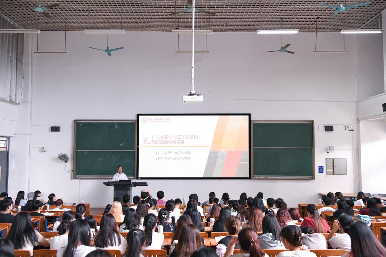 其次,何汉武深入解读了广东省委1310工作部署,即今年6月20日中国共产党广东省第十三届委员会第三次全体会议在广州召开,提出“锚定一个目标,激活三大动力,奋力实现十大新突破”的“1310”部署,这是围绕实现习近平总书记赋予的使命任务,进一步深化新时代新征程广东现代化建设的具体部署。在讲解“奋力实现十大新突破”时,何汉武特别将重点放在两个方面:即实现高水平科技自立自强和深入实施“百县千镇万村高质量发展工程”,随后他结合职业院校的使命与担当、联系我校师生实践贡献的实际,从“学校何为、教师何为、大学生何为”这三个方面剖析教育如何支撑广东走在时代前列,以及给高职院校学生带来的发展机遇。