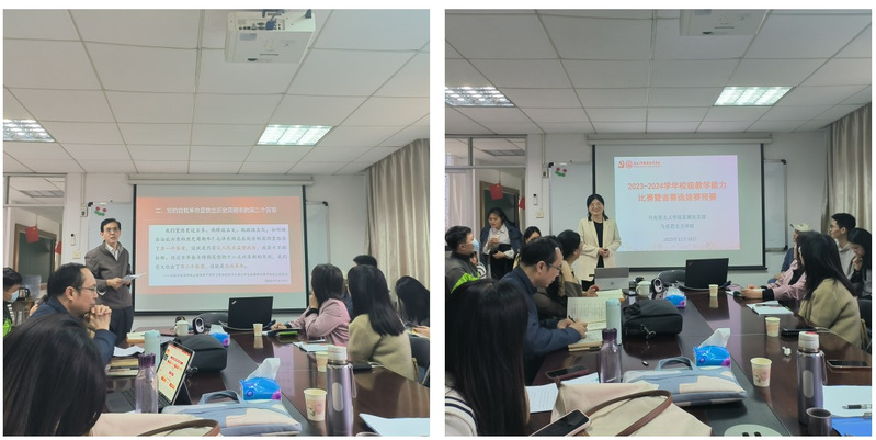 以赛促教,提升教学水平。为进一步提升思政课教师教学能力,部门开展2023-2024学年校级教学能力比赛暨省赛选拔赛团队教学展示活动。各教学团队根据比赛要求进行教学展示,其中赵聪团队展示内容为《准确把握“一国两制”科学内涵》,李莹团队展示内容为《勿忘国耻 振兴中华》。教学展示过后,大家各抒己见,在教学内容、教学特色和教学设计等方面提出了许多建设性意见。