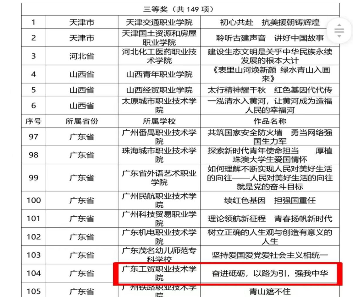 近日,由教育部社会科学司指导、教育部高校思政课教学指导委员会主办的“新思想引领新征程·新青年建功新时代”第七届全国大学生讲思政课公开课展示活动获奖名单公布。我校学生参赛作品《奋进砥砺·以路为引·强我中华》在全国评选中脱颖而出,荣获全国高职组三等奖。
