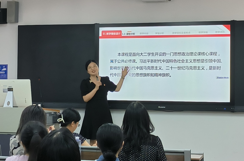 在比赛中,参赛教师分别从课程设置依据、课程目标、教学设计、教学资源、课程教学团队和课程应用与特色六个方面展开说课,紧扣人才培养目标和思政课立德树人目标,并依据课程特点,结合独特的教法、学法、教学过程等环节精彩展示说课程内容。教师们从容自信的姿态、条理清晰的语言,充分体现了马院教师扎实的教学基本功和良好的专业素养。