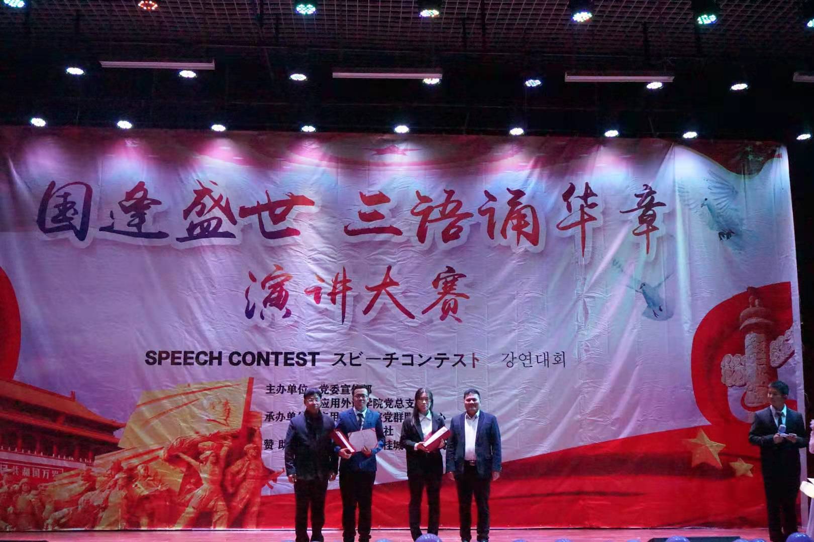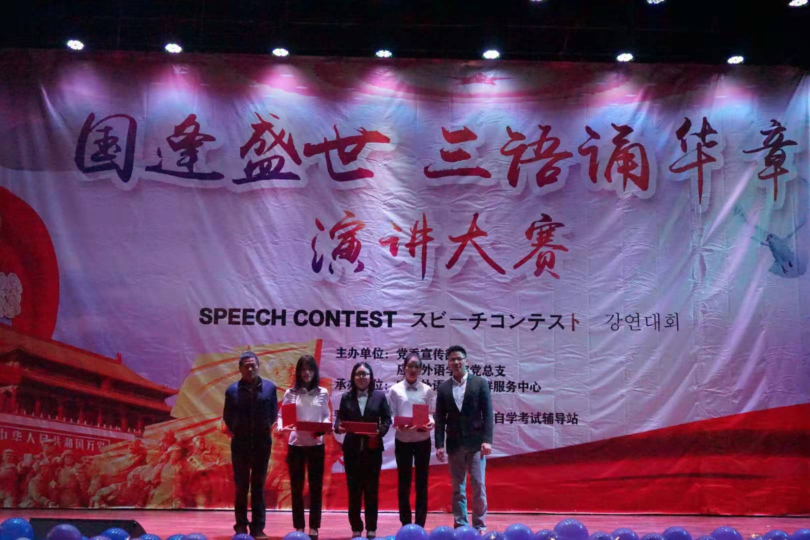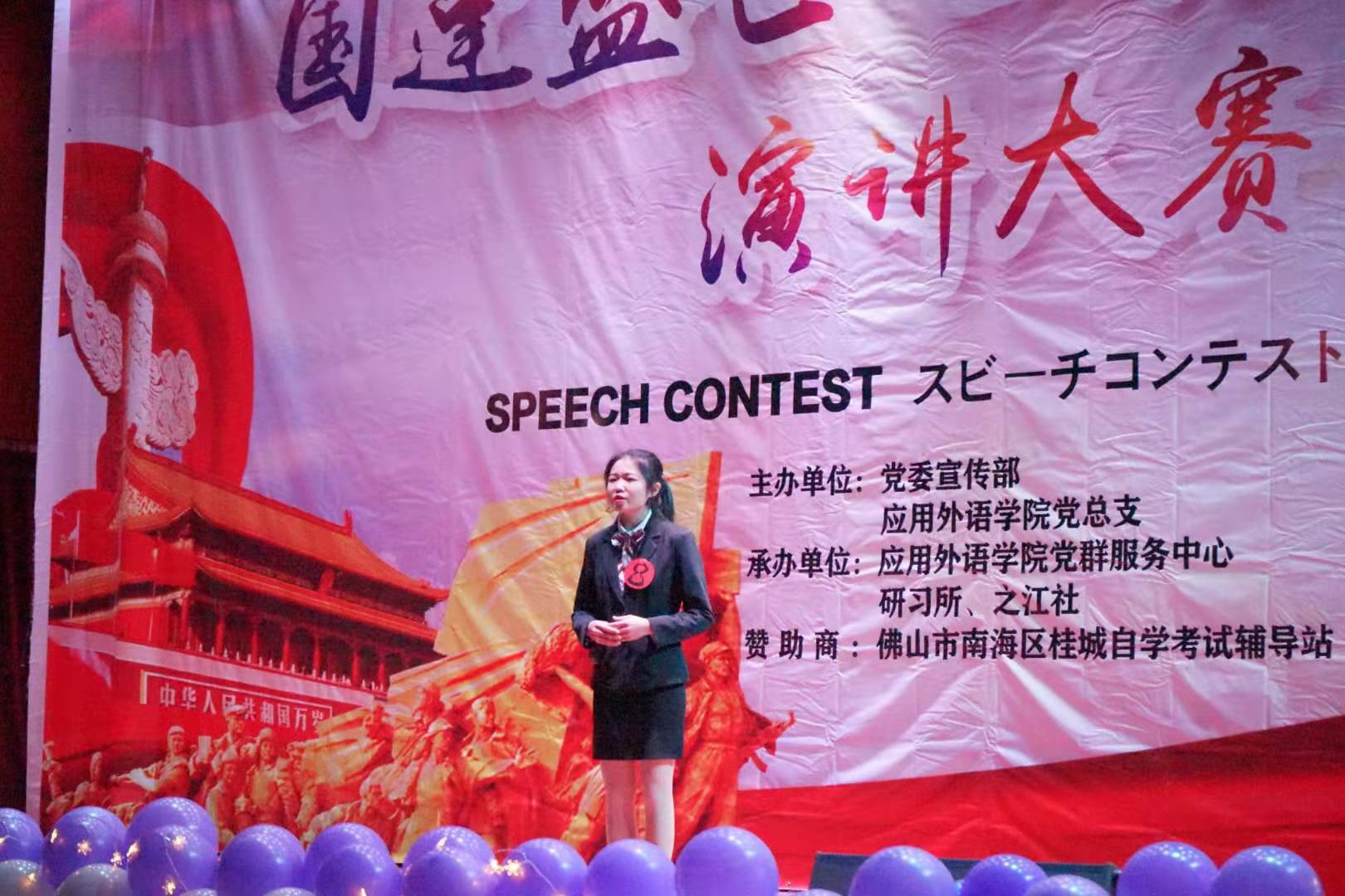 为诵中华人民共和国成立七十周年,加强我院同学的爱国热情,增强民族自信心和自豪感,培养专业能力,12月26日晚,应用外语学院党群服务中心在演艺厅举办以“国逢盛世,三语诵华章”为主题的演讲大赛。校党委副书记夏韩辉、外语学院党总支书记李德富、党总支副书记罗春科、副院长杨国民、旅游英语专业带头人曾昭涛教授,及相关专业教师、辅导员参加本次大赛。11位同学来自各班的演讲好手逐一登台展现风采。