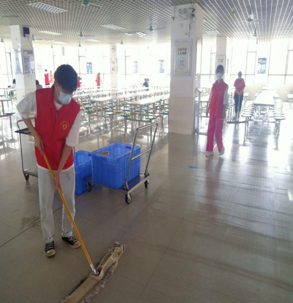 327日下午一点,志愿者到达指定地点找负责人进行签到、穿上志愿者服,在负责人的分配下,有序地开始了食堂义扫活动。大家各司其职,积极地去完成自己负责的区域。在食堂的桌子、地板、窗户、栏杆等各个角落都能看见他们认真负责的身影。通过志愿者们努力的打扫,在活动的最后,学校食堂有种焕然一新的感觉。